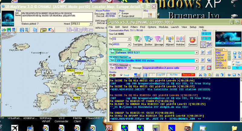 Salve, a tutti quelli che operano in modo digitale con la ISS International Space Station , nei modi APRS e PBBS sulla frequenza 145.825 Mhz, consiglio questo semplicissimo quanto geniale SOFTWARE, UISS by ON6MU e AGWPE by SV2AGW. Questi permettono con il solo utilizzo del computer, senza ausilio di MODEM o costosi TNC di attivare una stazione APRS e PACKET in grado di comunicare facilmente con la ISS e quindi essere TRACCIATI sulle mappe mondiali, oppure CONNETTERE la BBS di bordo e lasciare messaggi e bollettini mail-box indirizzati ai Radiomatori di qualsiasi nazione. Si tratta di utilizzare semplicemente istallando un software di engine packet, come AGWPE di SV2AGW, che puo' essere utilizzato indifferentemente da qualsiasi altro software radio in grado di operare in modo PACKET/APRS, una volta istallato AGWPE bisogna configurarlo assegnandogli una porta COM, per la gestione del PTT e indicargli la SCHEDA AUDIO del PC da autilizzarecome modem. Configurazione semplicissima, una volta lanciato agwpe compare una piccola icona sul sys-tray (vicino l'orologio di sistema) cliccate con il tasto Dx del mouse e selezionate la voce CONFIGURE, cliccate su NUOVA PORTA COM, un requester vi invita a selezionare una porta COM che gestira' il PTT ( RST-DTR) e alla voce Tipo di TNC selezionate SOUND-BLASTER, date OK , un ulteriore requester vi invita a selezionare la SCHEDA AUDIO interna al PC da utilizzare, tutto qui' la configurazione e' terminata, la porta COM attivera' il PTT mentre la scheda audio funzionera' da MODEM generando i toni packet AX25 1200/9600 baud. Se siete in possesso di una qualsiasi interfaccia per i modi digitali come questa http://hamradio.selfip.com/i6ibe/packet/packet.htm siete a posto, non avrete bisogno di altro. Con il MOTORE (Engine Packet) istallato qualunque programma che richieda o bisogna di un TNC puo' utilizzarlo, se disponete di UI-VIEV per l'aprs questo funzionera immediatamente senza ausilio di TNC o MODEM, basta lanciare UI-VIEW, da menu COM SETUP, indicate alla voce HOST MODE selezioniamo AGWPE e siamo a posto, configurazione terminata, premete F9 per irradiare il vostro BEACON APRS per essere immediatmente tracciati. Idem per il software UISS basta lanciarlo, per essere immediatamente attivi in modo PACKET e collegare la ISS, aggiungendo dei MODULI scaricabili da http://users.belgacom.net/hamradio/uissdownload.htm si cambia modo operativo APRS, GPS, SSTV, ORBITRON, SPECH ecc, rendendo facilissima il traffico ISS APRS e PBBS, software graficamente interessante, freeware, la configurazione e l'utilizzo risulta molto facile e intuitivo., messaggi preregistrati per coordinate, BEACON RS0ISS-4 e messaggi RS0ISS-11 PBBS. Sulla stessa frequenza della ISS 145.826 Mhz e ' attivo in modo PAKET Ax25 1200 baud anche il satellite PCSAT NO-44 anche esso decodificabile con agwpe, la TELETRIA trasmessa in diretta permette il controllo a terra delle variabili relative alle celle solari e della tensione delle batterie di bordo, buon divertimento de IVO I6IBE