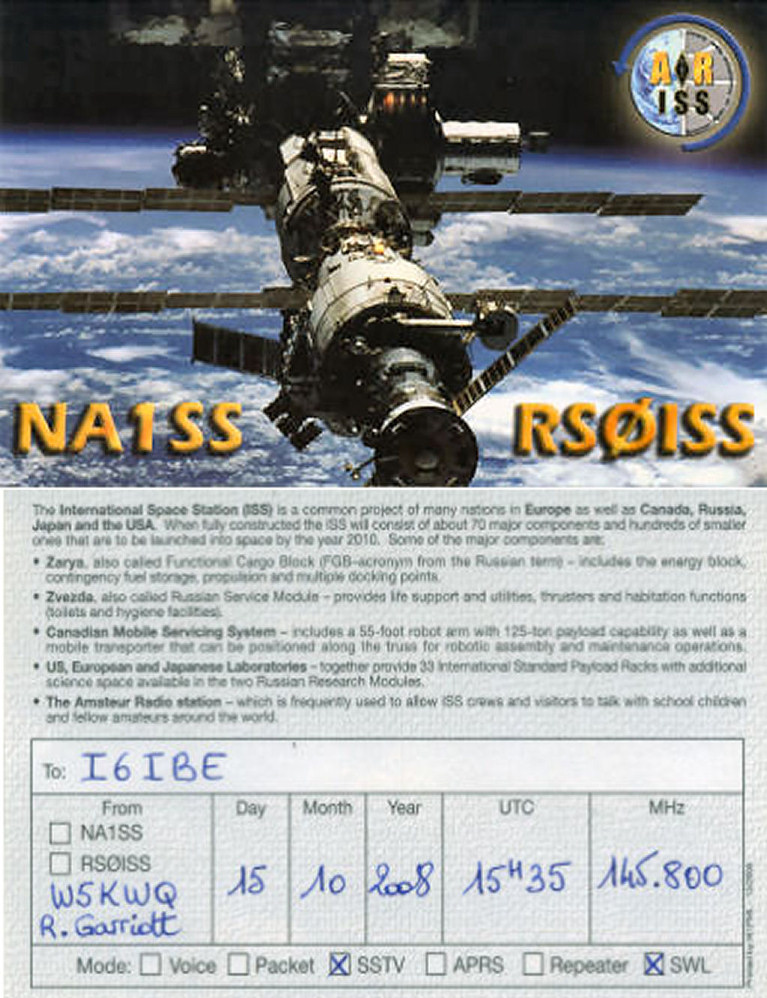 Questo satellite e' facislissimo da operare soprattutto in modalita' PACKET. La frequenza di downlink e' 145.800, quella uplink 145.990, si trasmette si riceve sui 2 metri in FM, ascoltate un orbita rimarrete impressionati per la facilita' di ricezione e per la qualita' dei segnali. In pratica basta una antenna monobanda verticale per poter transitare sulla ISS facilmente, il segnale a terra arriva con un S8 e non occorrono ricevitori particolari, nessun tono subaudio e' richiesto. Utilizzate il soft ORBITRON per il calcolo delle orbite ! Io ho utilizzato un TM-721 Kenwood , ora lo YAESU FT-897, per il PACKET basta il solito MixW32 settato in modalita' packet 1200 Standard (1200-2200) , al passaggio della ISS, da menu mode, CONNECT RS0ISS-11 (invio) .. ora siete connessi con il PMS (Personal Message System), al prompt dei comandi potete leggere o lasciare messaggi per altri OM , leggere bollettini, e cancellare quelli a Voi indirizzati. Molti OM chiamano in modalita' UNPROTO utilizzando RS0ISS/3 come digipeater. MixW prima di operare in Packet va' configurato, nel MODE SETTING al posto del NOCALL va messo il vostro NOMINATIVO, non abilitate il BEACON, alla sezione MODEM selezionate VHF 1200 baud standard. Prima di chiamare ISS fate qualche PROVA PACKET connettendo OM locali , una volta sicuri della qualita della vostra connessione packet siete pronti per ISS. Prima pero' LEGGETE ATTENTAMENTE il manuale operativo del PMS di bordo ! Cliccate sul link per scaricare il manuale PDF L'uso del PPMS acura di WF1F tradotto in Italiano da IK1SLD Claudio, ... Cliccate sull'immagine MIXW32 per ingrandire e visualizzare il mio PRIMO QSO PACKET con la PPMS di bordo della ISS. Vedi anche articolo completo. La ISS e' visibile anche ad occhio nudo, un appassionato, il signor Roberto Pellin di Treviso , ha FOTOGRAFATO (vedi le foto) la ISS da terra, ottenendo risultati molto interessanti .