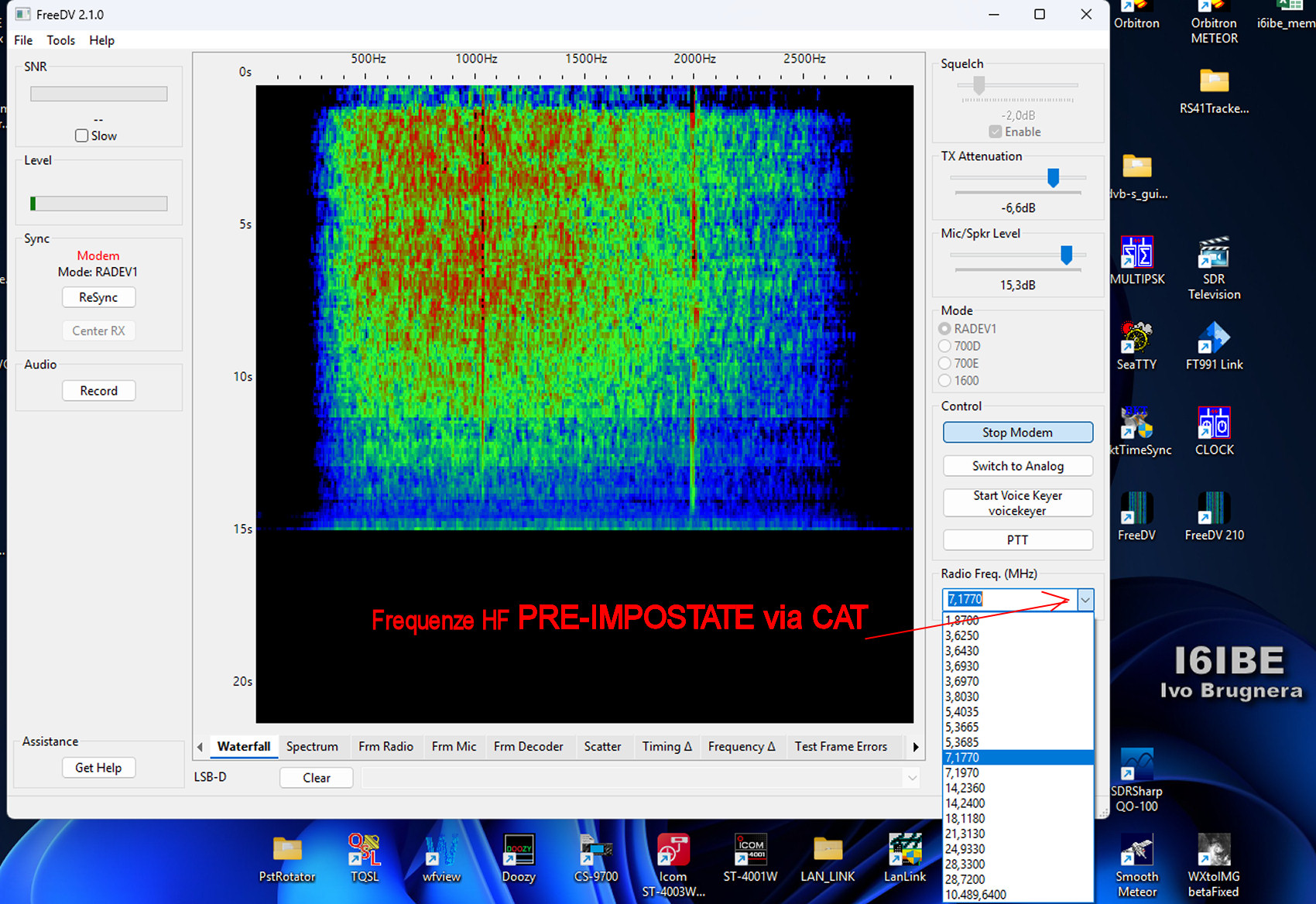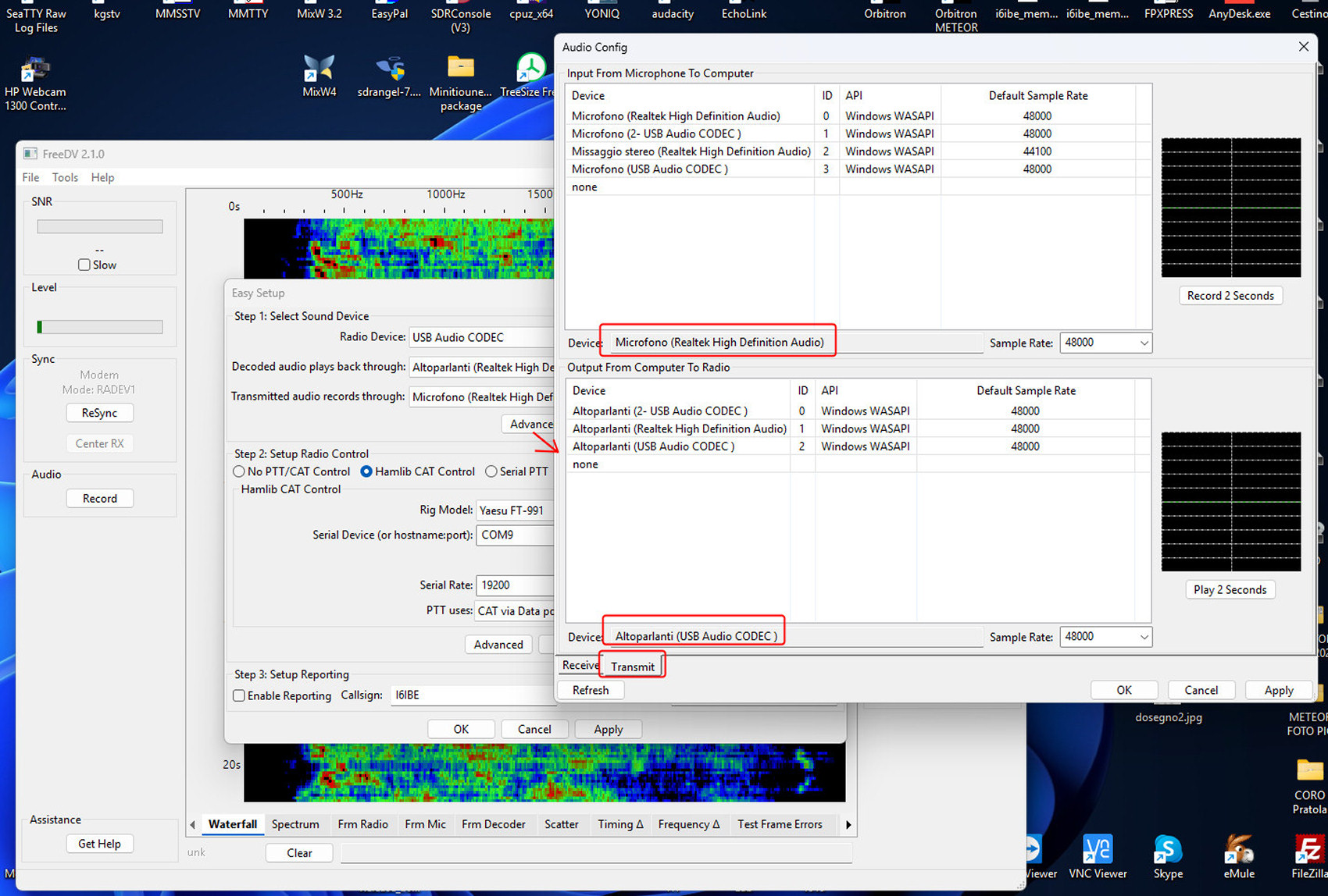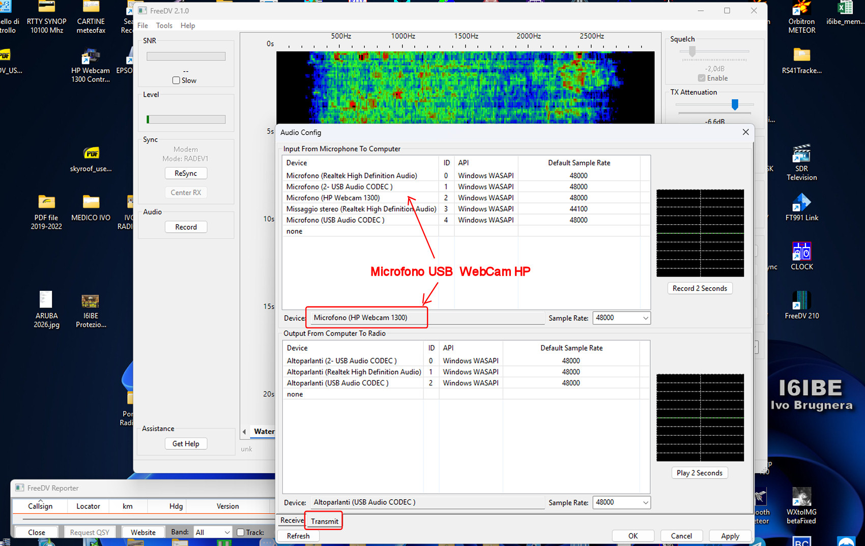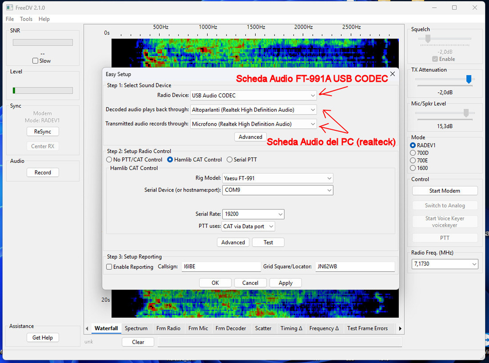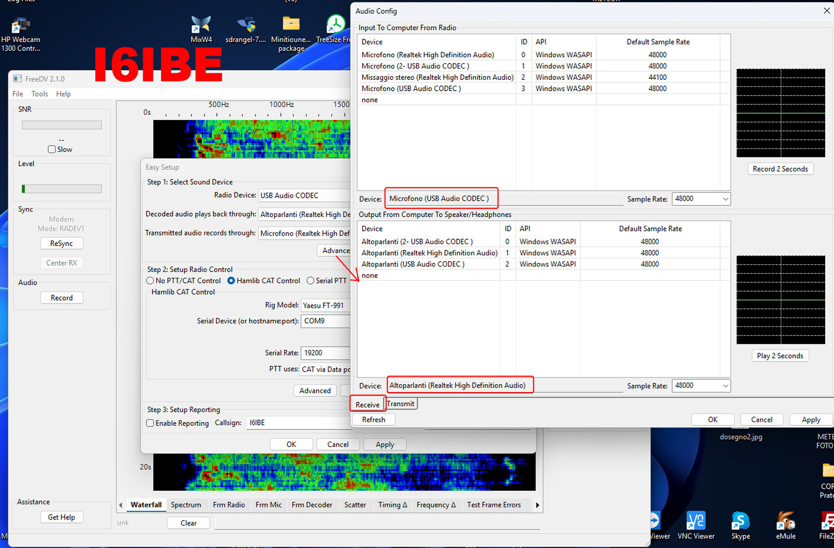 Trasmissioni HF frequenza 1,6-30 Mhz MHz in DIGITAL VOICE software FreeDV utilizzabile/consentito anche sul satellite geostazionario OSCAR-100 Es'Hail-2 Come tutti anche io appassionato di fonia digitale ho testato WINDRM, FDMDV, DIGTRX https://www.radioamatoripeligni.it/i6ibe/digital/fdmdv.htm, ma nessuno era soddisfacente, voce da avvinazzato risultati deludenti, ricordo i primi test con FREEDV anni fa, doppia scheda audio, frequenze non note e pochissimi corrispondenti. Poche ore fa scarico e installo la versione ultima 2.10, sono rimasto piacevolmente sorpreso, gestione CAT e PTT, FREQUENZE standard pre-impostate come per FT8, configurazione audio facile e veloce, con i moderni RTX non richiede la doppia scheda audio, utilizzate quella del PC e quella della RADIO RTX (USB audio CODEC) nel mio caso FT991A rigorosamente in Mode DATA-USB, come microfono, se non ne avete uno da collegare alla scheda audio, usate quello della WebCAM USB. Niente interfacce o schede audio aggiuntive, solo PC e RTX.Durante i test il mio 991A via CAT ha sintonizzato automaticamente 7.177 MHz, 30 Watt in prova, pensavo non ci fosse nessuno ma risponde SV2BWY insieme ad un suo amico ambedue in test e prova, alle prime armi come me, ci siamo complimentati a vicenda per il FIRST-ONE fonia DIGITALE tra GRECIA e ITALIA, un qso alla sprovvista cercando di districarsi e capirsi con l'ostica lingua Inglese, da dire che il segnale, rispetto ad una decina di anni fa e praticamente cambiato, ora la voce e uguale all'originale, quasi meglio del C4FM, DSTAR e DRM. La voce processata da analogica a digitale viaggia via etere, il software provvede alla codifica/decodifica, quindi alla radio sentirete solo il segnale DIGITALE, un ronzio, il QSO o meglio la VOCE decodificata arriva dalla casse del PC. Per il download sono disponibili versioni free per WINDOWS, MAC, LINUX. In basso immagini relative alla configurazione passo passo AUDIO I/O con il mio FT-991A Yaesu, e comunque uguale a tutti gli altri RTX HF con SoundBlaster e Porte COM virtuali On-Board. Software freeware da provare sicuramente, divertimento assicurato, 73 Ivo I6IBE gennaio 2026.