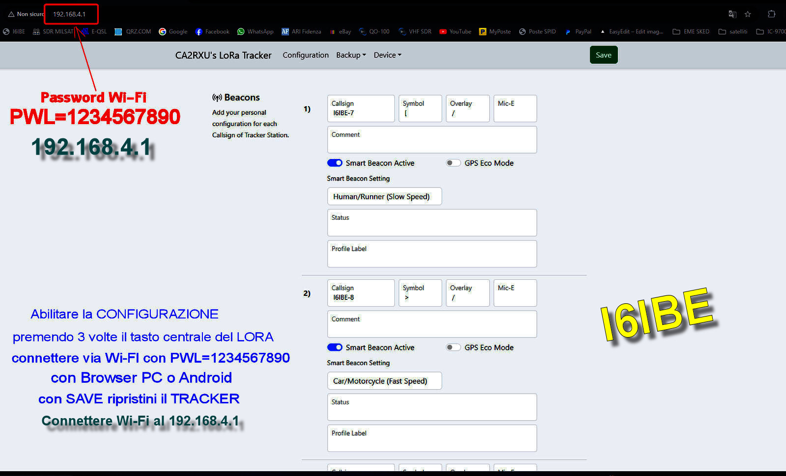 Ho anche io cominciato questa avventura spinto dal collega Radioamatore Vittorio IW8XOI, operare in APRS "Automatic Packet Reporting System" con l'ausilio di device a tecnologia avanzata e miniaturizzata e con un investimento iniziale prossimo allo zero, utilizzando le reti alternative, indipendenti Open-Source Meshtastic, Meshcore e Meshcore con moduli LoRa (Long Range) low cost, muniti di GPS e TX Uhf e batteria, in grado di inviare via radio e in rete internet informazioni utili alla tracciatura geolocalizzazione su mappe mondiali visualizzabili su APRS.FI, tramite piccoli TX (100 mW) operanti, per convenzione in Europa sulla frequenza 433,775 Mhz, iGate e Digipeater, i dati telemetrici relativi alla posizione Long/Lat GPS, Messaggi, dati Meteo, e addirittura E-Mail sulla rete WinLink HF e Satelliti o WinMore, utilissimi anche in scenari di emergenza con rete Internet oscurata, bloccata, disattivata. Oltre alla rete LoRa Radioamatoriale a 433 MHz, sono operative anche reti alternative di appassionati su 868 e 915 MHz. Per farla breve, basta acquistare un modulo LORA, collegarlo all PC via cavo USB, aggiornare il FIRMWARE tramite porta COM (virtuale) con WebFlasher (CA3RXU) senza ricorrere al download e utilizzo di software di terze parti, Configurare via Wi-Fi Android o PC collegandosi alla rete wi-fi LoRaTracker-AP con PWL=1234567890, e di seguito con il Browser, al 192.168.4.1 impostare i SSID da Nocall a I6IBE-8 (automobile) I6IBE-7 (bicicletta) I6IBE-5 (camminata/corsa/escursione), salvare i parametri e siete subito operativi in APRS, all'accensione del modulo LoRa, verra' inviato il primo pacchetto TX Beacon LoRa e immediatamente tracciati sulle mappe APRS. Di seguito link web utili, di OM preparati, appassionati e valenti sperimentatori, esperti di APRS, che meglio di me trattano l'argomento con dovizia di particolari, con LINK utili, TUTORIAL, DOWNLOAD files, INFO, FIRMWARE e tanto altro. Scusate eventuali inesattezze, errori, bug e svarioni su questa pagina web, sto testando tale sistema da poche ore, eventualmente correggetemi, aggiungete, contribuite con altre pubblicazioni. Buon divertimento, 73 Ivo I6IBE gennaio 2026