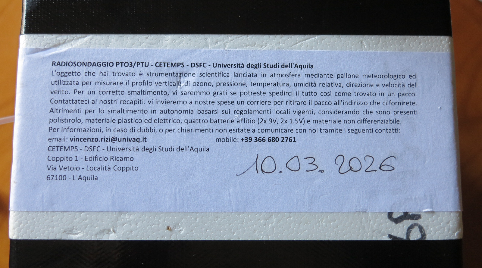Radiosonda RS41S + Sensore OZONO by UNIVAQ Universita degli studi dell'AQUILA